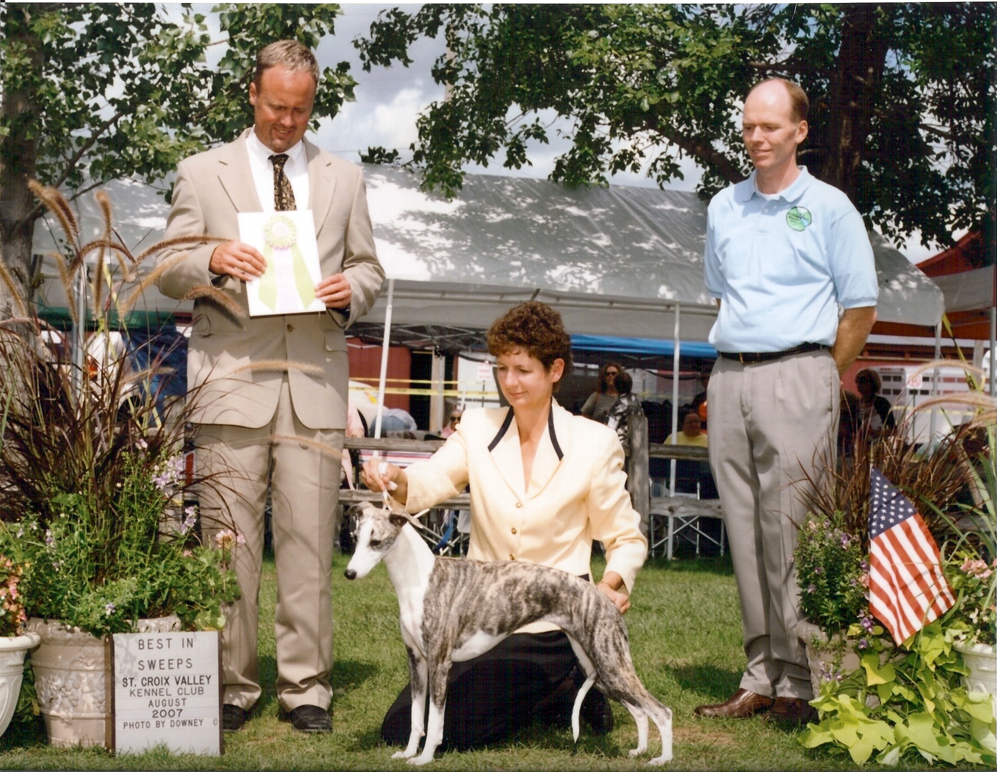 “Dazzle” finished her show career easily with three majors, one of them being a five point. She took two Best In Sweeps along the way. She is shown here winning Best in Sweeps at the North Central Regional Specialty under Tad Brooks.